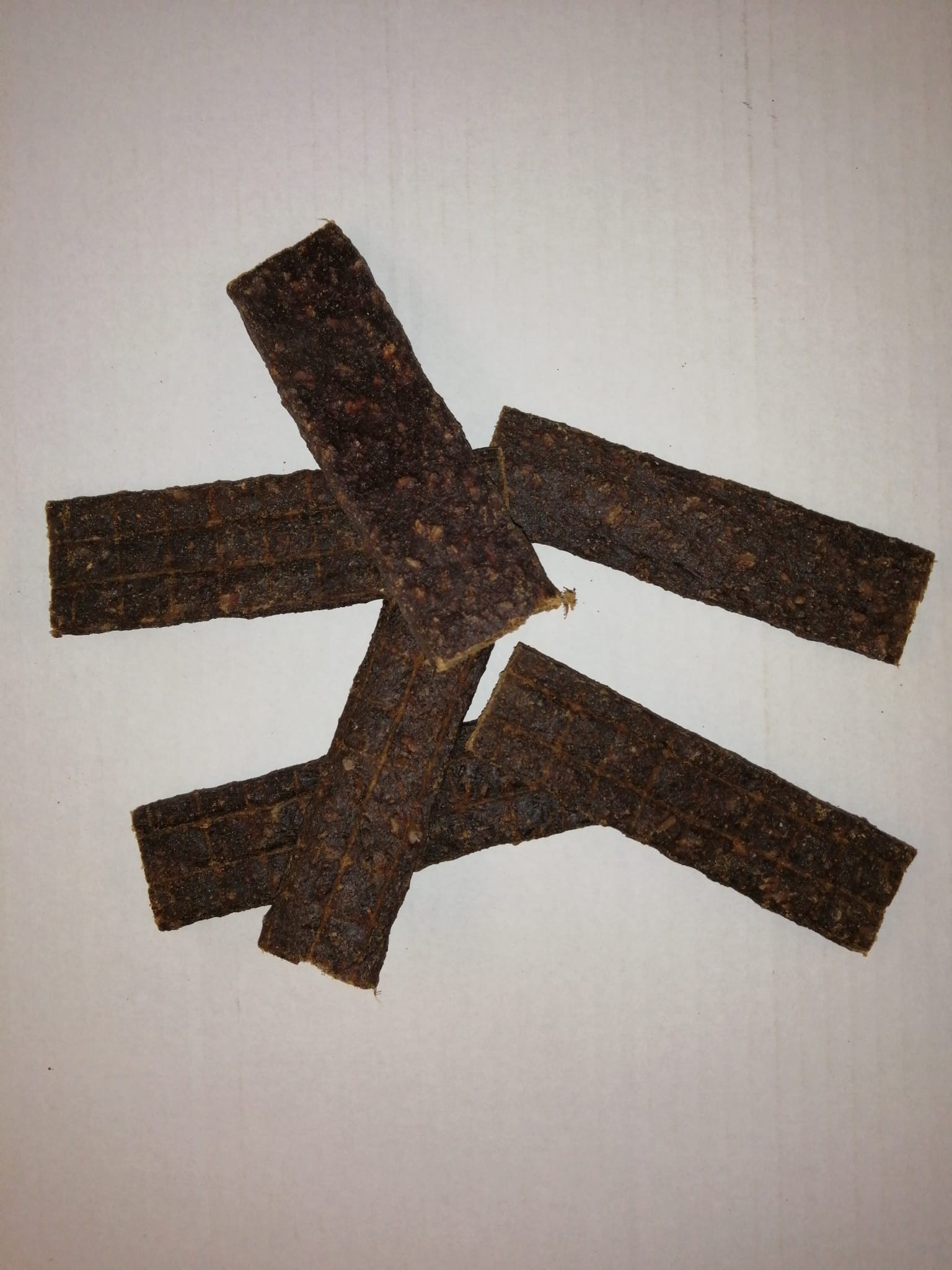 Rehfleischstreifen getrocknet, aus heimischen Wäldern. Einzelfuttermittel, Kauartikel. Kühl und trocken lagern. Die einzelnen Fleischstreifen sind ca 11cm lang.